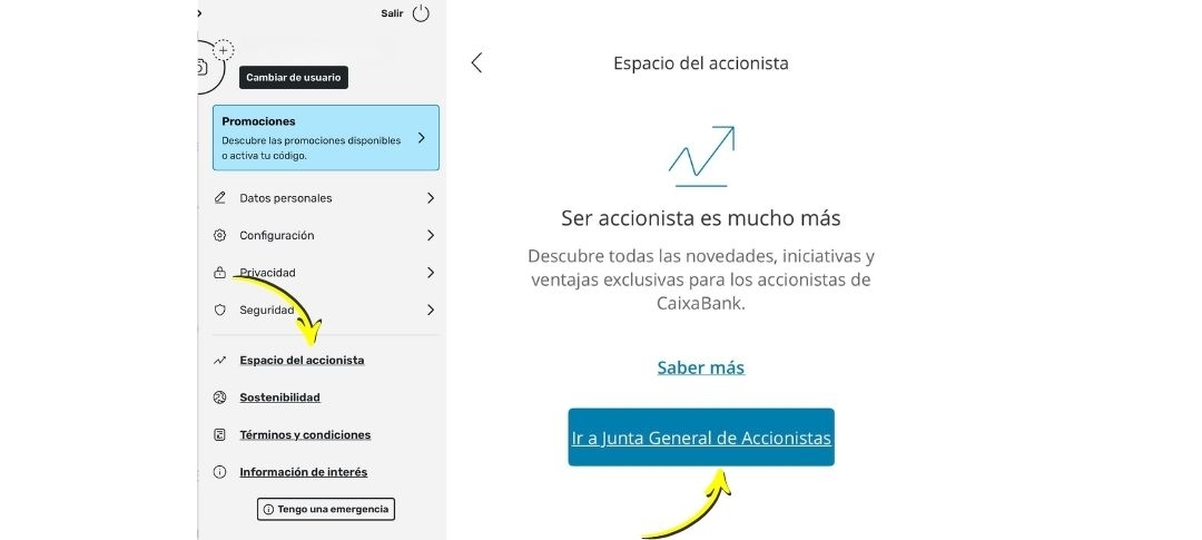 A l’app CaixaBankNow: el meu Perfil ➡️ clicar a les teves inicials a dalt a la dreta ➡️ Espai de l’accionista ➡️ Anar a Junta General d’Accionistes / Delegar vot.