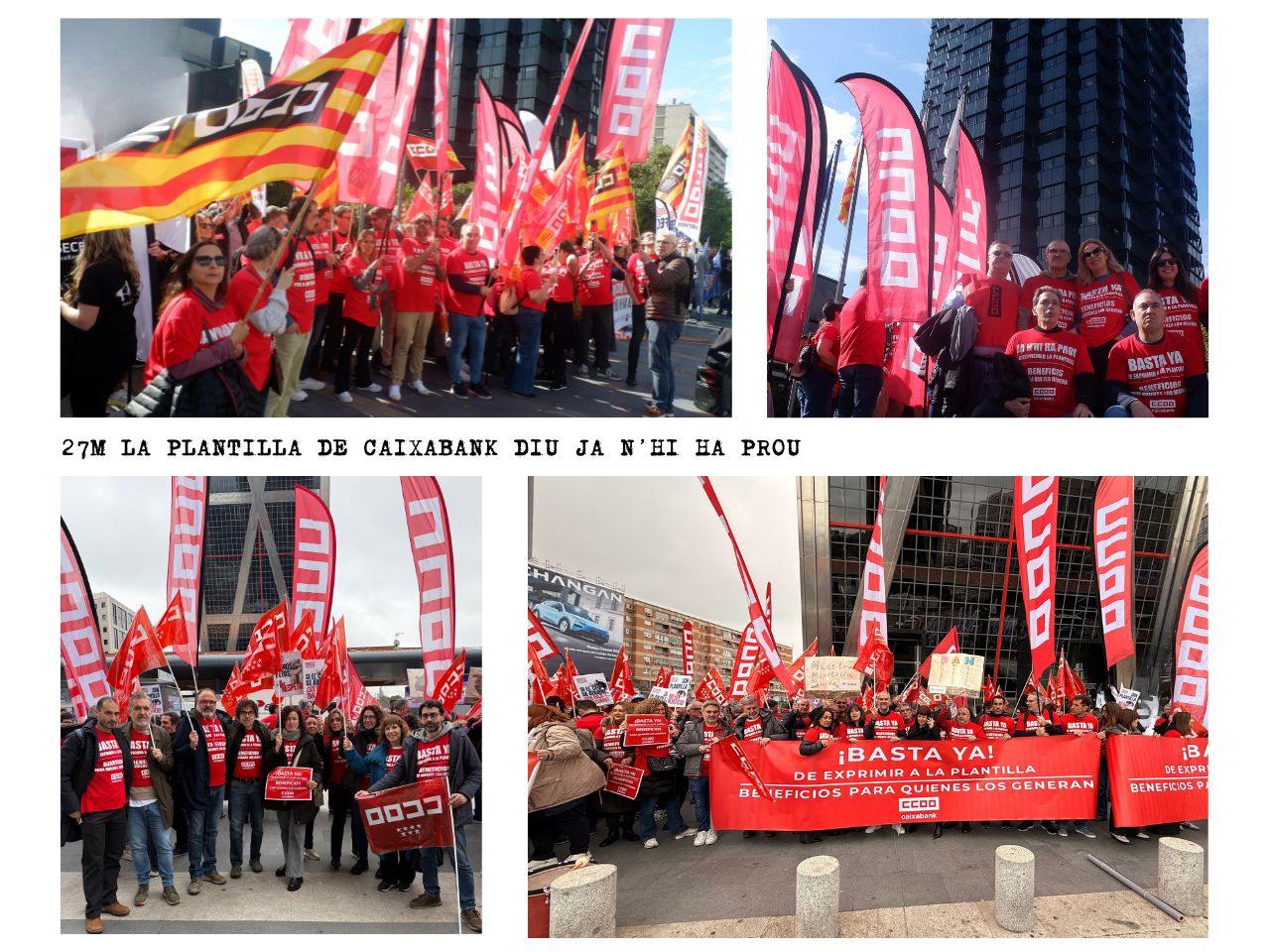 Les organitzacions sindicals que conformem la Representació Legal de les Persones Treballadores (RLPT) a CaixaBank hem convocat la Vaga del Divendres 27 de març, el dia de la Junta General d’Accionistes, per denunciar que la situació de la plantilla és insostenible, exigir compromisos, mesures concretes, verificables i amb conseqüències reals, al voltant de 4 eixos, que ja hem detallat en comunicats anteriors amb la convocatòria de l’aturada del 9 de març: