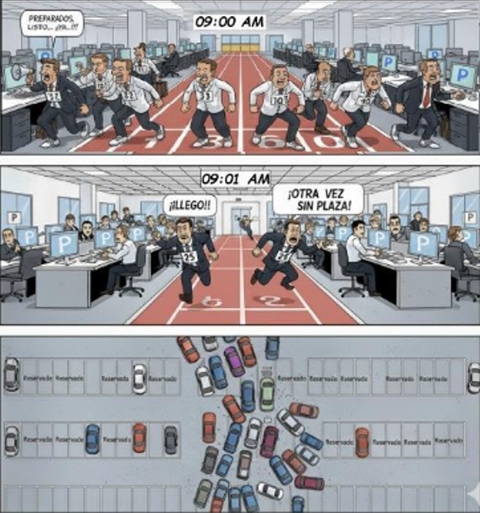 09:03 AM Por los pasillos. Esto es indignante, otra lotería más. Qué vergüenza de sistema, y luego llegas al parking y está medio vacío. Y gente con plazas fijas para siempre, vengan o no vengan al edificio…
